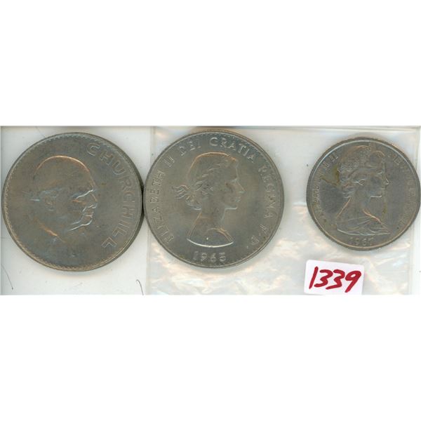 2x 1965 Winston Churchill Commemorative 5 Shillings coins & 1x 1967 New Zealand 50 cent coin