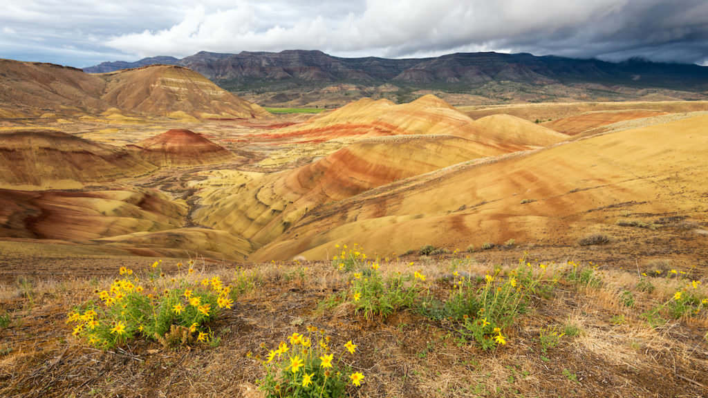 Region: Eastern Oregon. Name: Painted Hills. Wild Notes: In the canyons of Wheeler County lie the Painted Hills. Part of the John Day Fossil Beds National Monument, the hills reveal the many, colorful layers of the earth. Wildflowers in the area include the John Day Chaenactis.